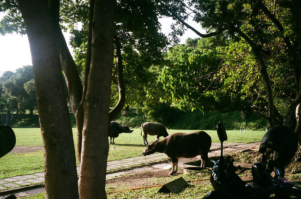 鷺鷥草原上的牛們。充滿綠意的石板路是從後山自強路走路到學校必經的路徑。